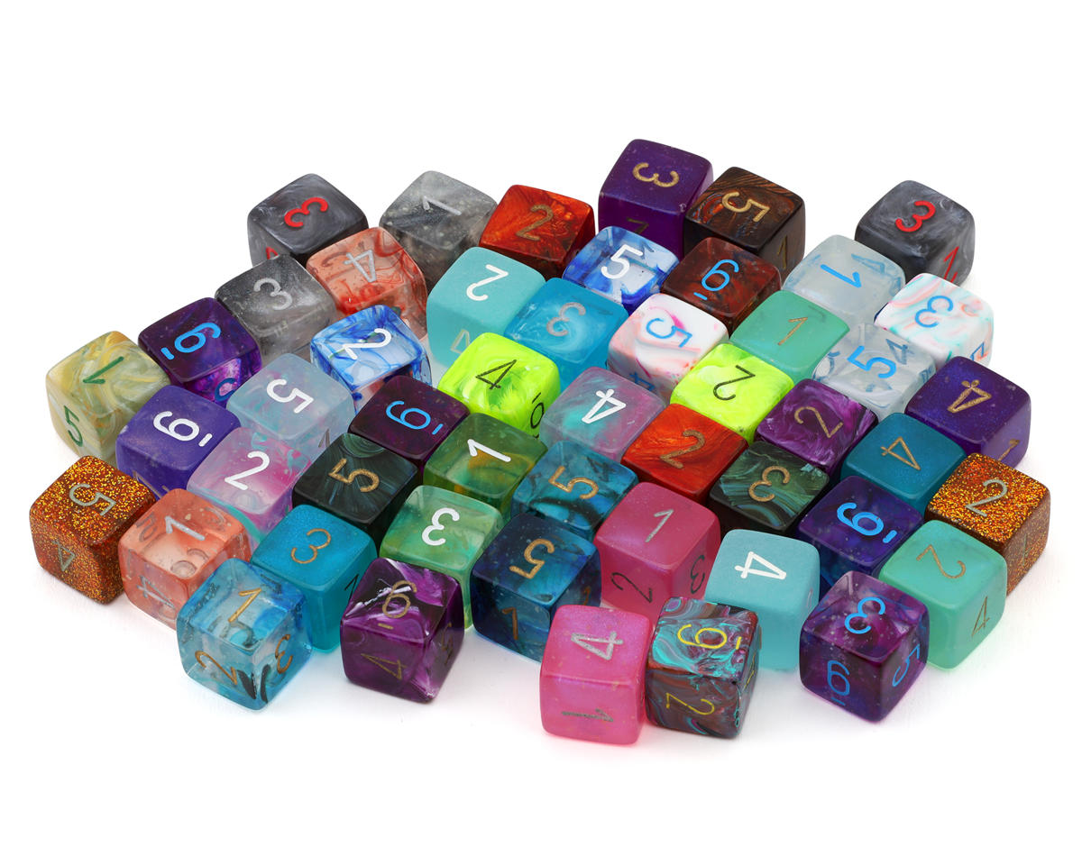 - Incluye una mezcla de cincuenta dados de seis caras de múltiples series de Chessex