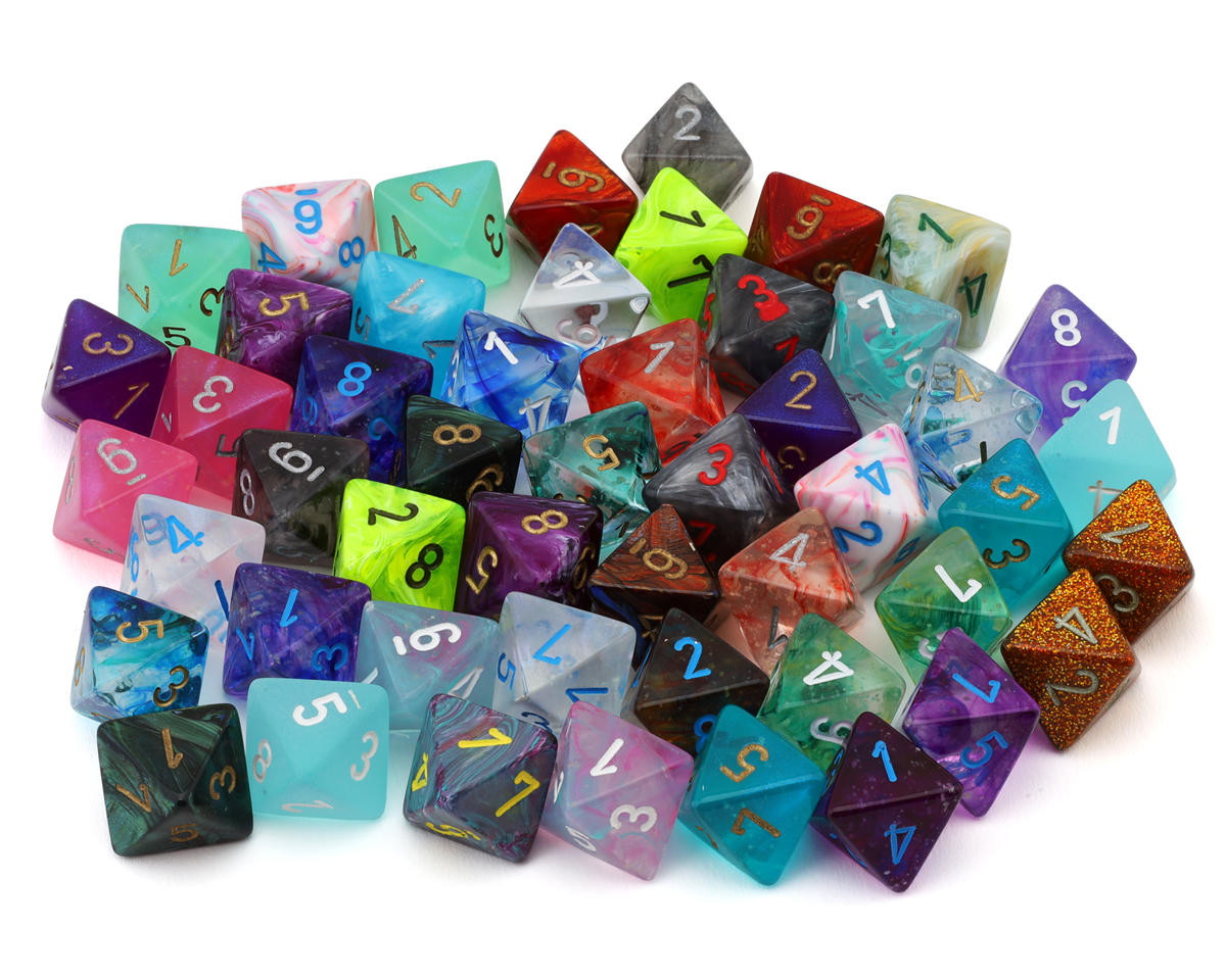- Incluye cincuenta dados D8 con variaciones únicas de color y diseño