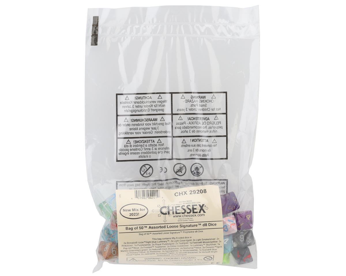 La bolsa de 50 dados poliédricos D8 sueltos surtidos Signature de Chessex es un complemento perfecto para jugadores de mesa y coleccionistas. Este emocionante set incluye una increíble variedad de colores y diseños, ofreciendo una estética única para mejorar cualquier juego o colección de dados. Con una construcción de alta calidad y acabados vibrantes, estos dados garantizan precisión y estilo en cada lanzamiento.