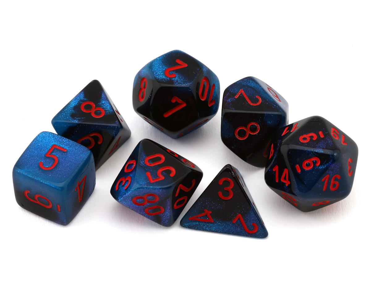El Set de 7 Dados Poliédricos Gemini en Negro-Starlight/Rojo de Chessex está diseñado para juegos de rol de mesa como Dungeons & Dragons. Este set incluye siete dados fabricados con precisión, cada uno con un llamativo color negro-starlight y números rojos resaltados, lo que lo hace perfecto para jugadores que aprecian tanto la funcionalidad como el estilo. Estos dados de alta calidad están diseñados para proporcionar lanzamientos fluidos y confiables en cualquier sesión de juego de rol.