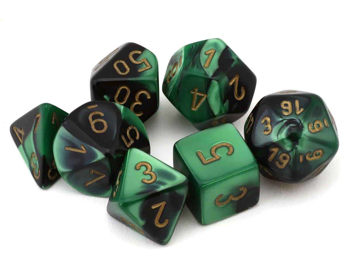 - Set de dados poliédricos de siete piezas en negro-verde con números dorados