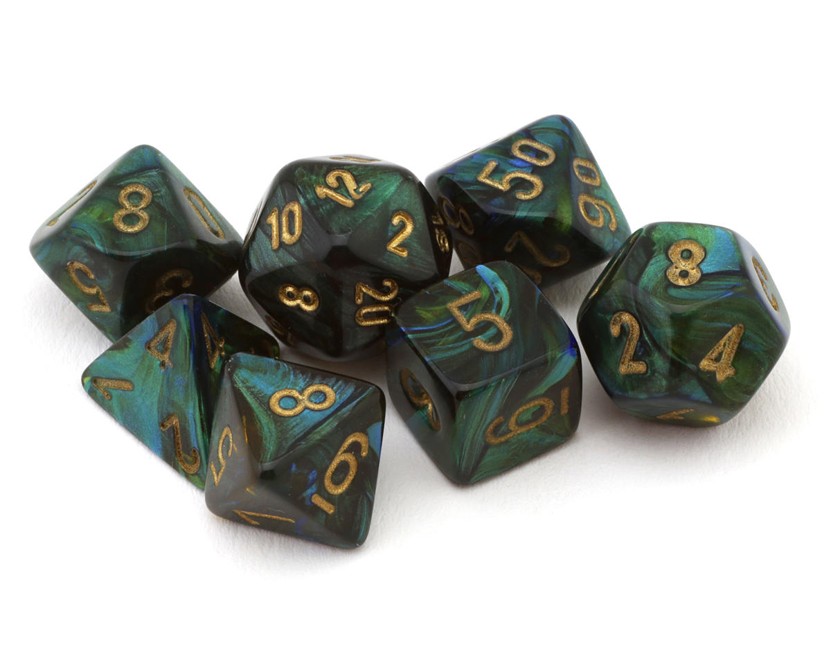 - Incluye siete dados para juegos de rol de tamaño mini con acabado jade y dorado