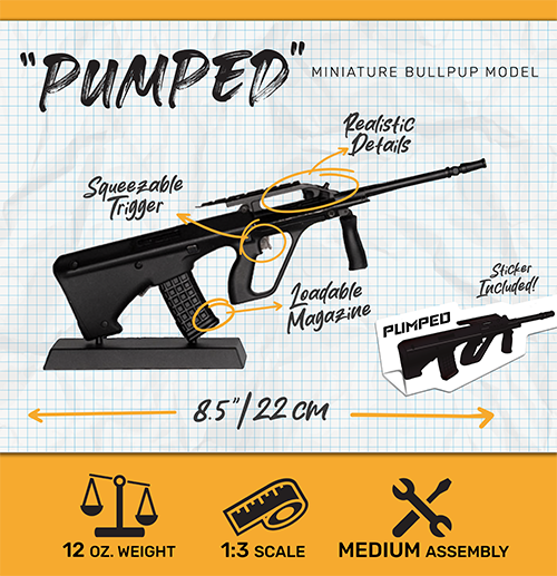 Elegante. Rápido. Al acecho. Utilizado por militares en todo el mundo, el Bullpup es muy veloz. Ahora puedes obtener la versión en miniatura, perfecta para exhibir en un escritorio o estante. Se arma y se puede personalizar con accesorios.