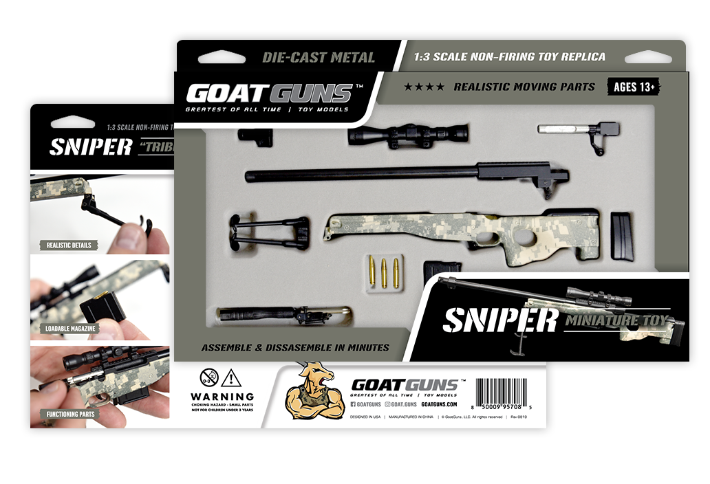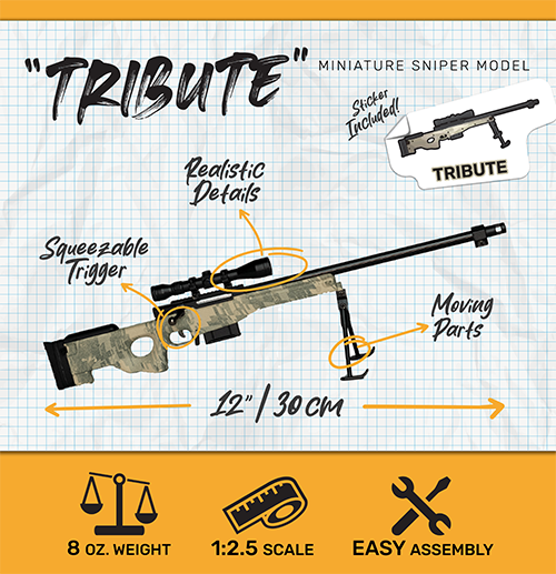 - Este modelo de francotirador con camuflaje digital es a escala 1:3. ‘TRIBUTE’ tiene 30 cm de largo y pesa 226 gramos.