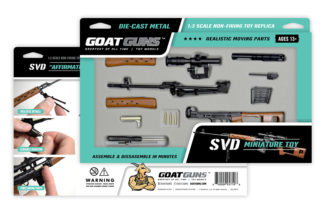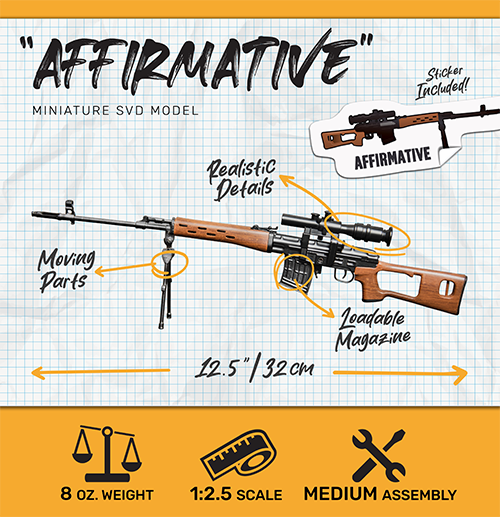 - La ‘Affirmative’ armada alcanza las 28 cm. Es una escala 1:4 exacta de la SVD. Es 100% diecast de metal, incluyendo el acabado tipo madera (a diferencia de los modelos AK donde el acabado tipo madera es de plástico).