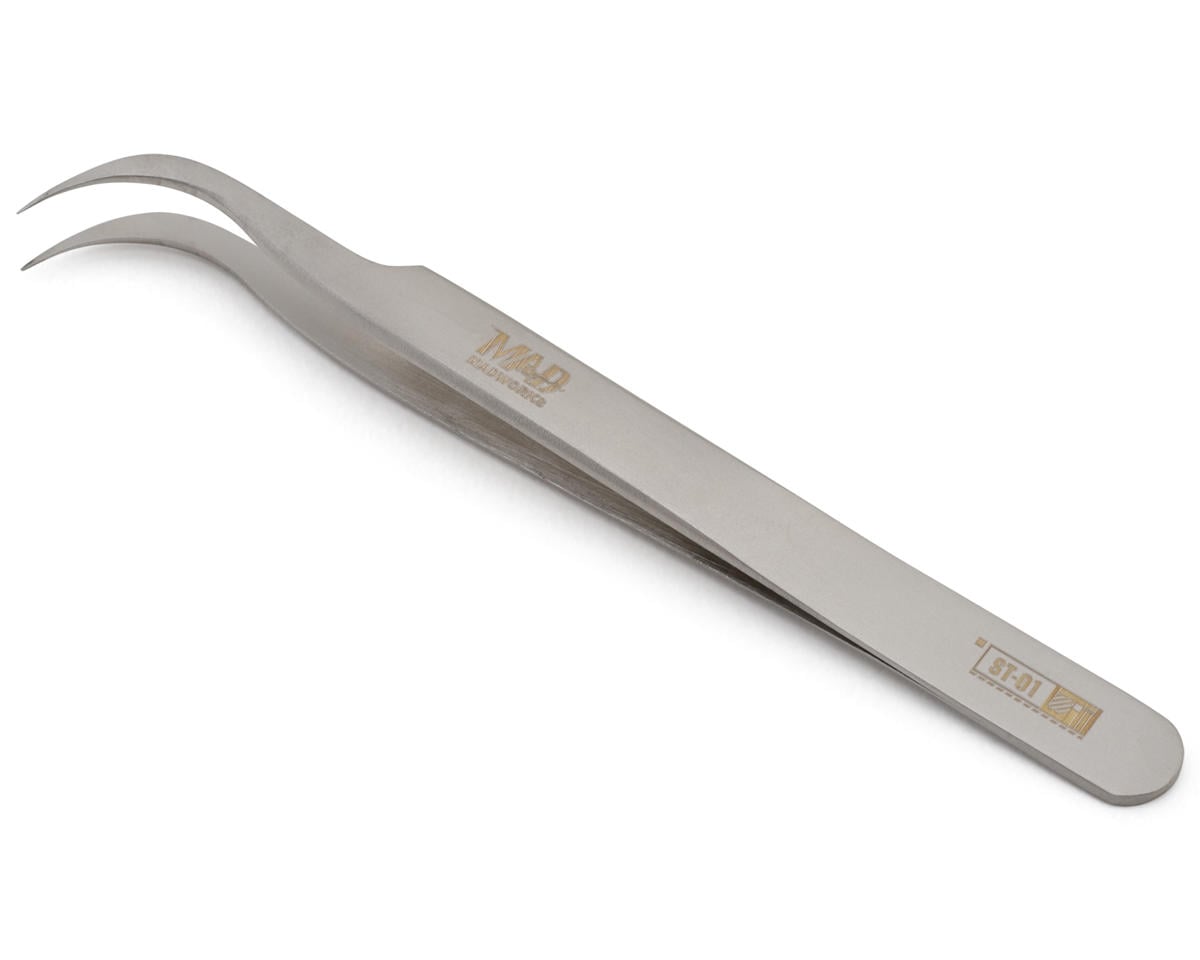 Las Pinzas Angulares de Acero Inoxidable de Madworks son una herramienta premium fabricada para trabajo de precisión en modelismo a escala y manualidades en miniatura. Hechas de acero inoxidable reforzado y terminadas con una textura arenada, estas pinzas ofrecen tanto durabilidad como un agarre refinado.