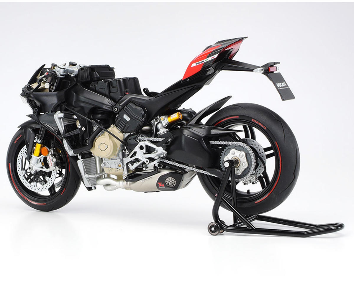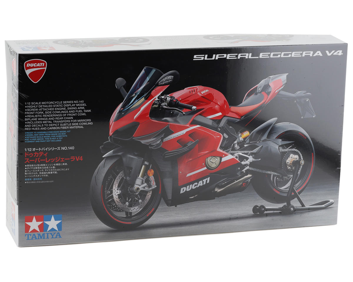 Este es el kit para armar de la motocicleta Ducati Superleggera V4 a escala 1/12 de Tamiya. Diseñado para representar las increíbles características y apariencia de la Ducati Superleggera V4, este modelo está lleno de detalles a escala. La Ducati Superleggera V4 es una motocicleta de calle inspirada en las carreras, capaz de un rendimiento extremo, y cuenta con un motor V4 único que le otorga a esta moto una relación potencia-peso de 1.54 hp/kg. A este rendimiento se suma la incorporación de varias piezas de fibra de carbono, como los carenados, el chasis y el basculante. Con la atención al detalle de Tamiya, estas características han sido recreadas fielmente con ensamblajes y componentes altamente detallados.