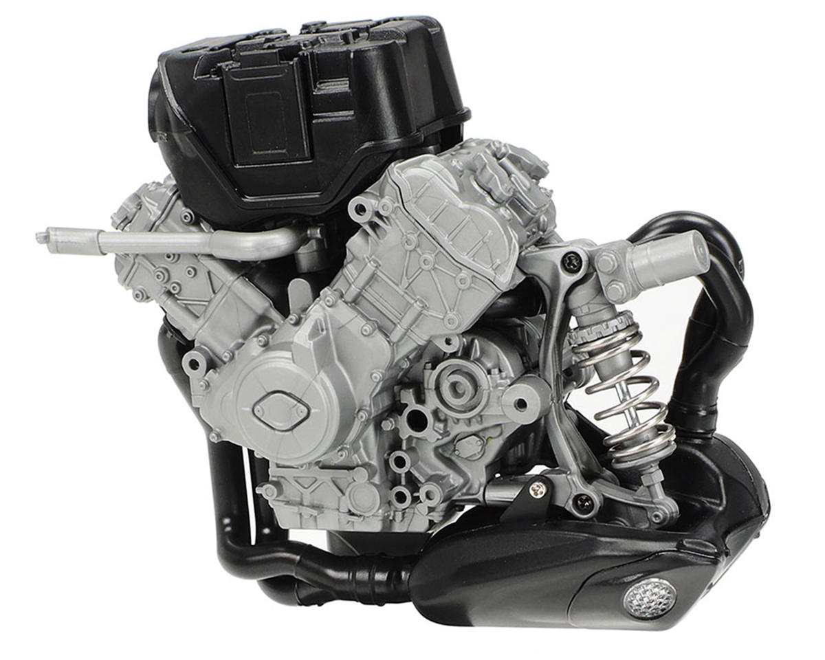 - El motor V4, el basculante, la horquilla delantera, los carenados laterales y el tanque de combustible se fijan al chasis mediante tornillos. Los carenados laterales y el tanque de combustible son removibles incluso después del armado.