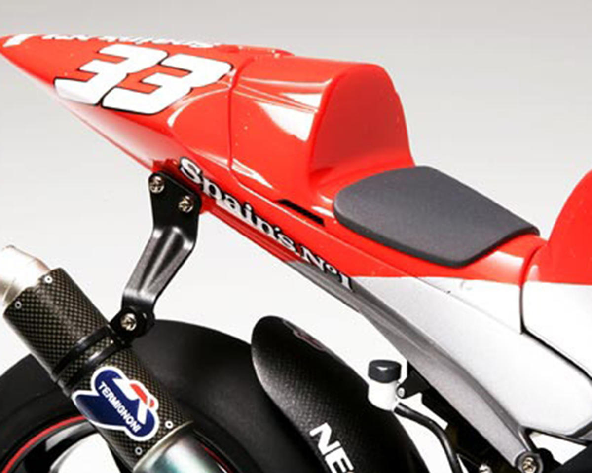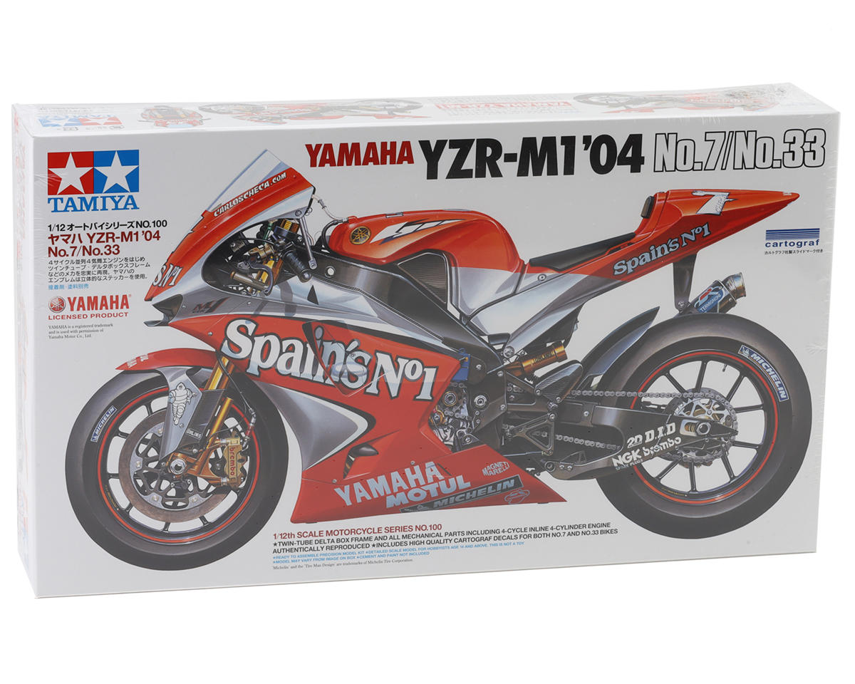 Vive la emoción de MotoGP con el kit para armar de motocicleta Tamiya 1/12 Yamaha YZR-M1’04 #7 y #33, una réplica de precisión de la moto pilotada por Carlos Checa y Marco Melandri en la temporada 2004. Este kit muestra el icónico chasis delta box de doble viga de la YZR-M1 y el motor de 4 cilindros en línea de 990cc, capturados con un detalle asombroso. Con un carenado y tanque de combustible removibles, la mecánica interna como la caja de aire ram, la suspensión y el escape son totalmente visibles. Neumáticos de caucho realistas, calcomanías Cartograf y un carenado de asiento adicional para la complexión más pequeña de Melandri añaden aún más autenticidad, convirtiéndolo en una pieza imprescindible para coleccionistas y entusiastas de las motocicletas.