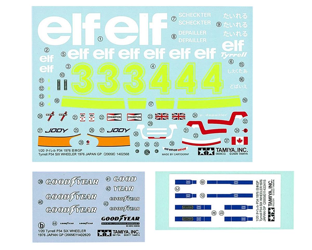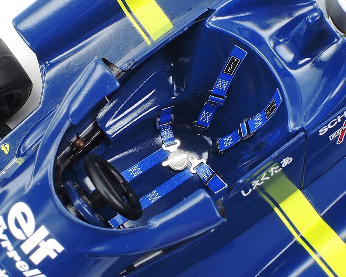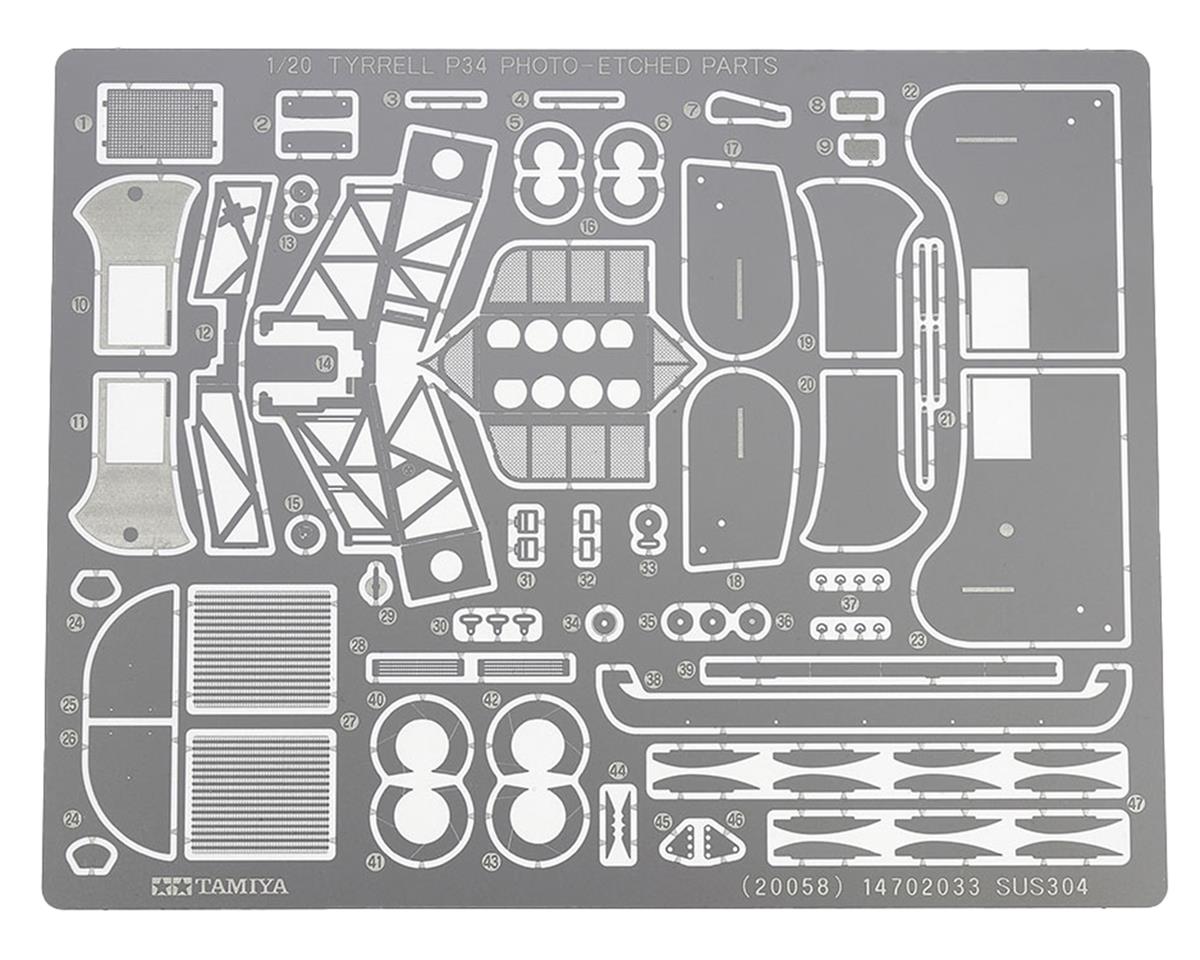 Tamiya 1/20 Tyrrell P34 Six-Wheeler Kit de plástico para armar con piezas de fotograbado. El Tyrrell P34 causó sensación en el mundo de la F1 cuando fue presentado en 1975. El diseñador buscó mejorar el rendimiento de frenado y en las curvas reduciendo el tamaño de los neumáticos delanteros que generaban resistencia, mientras mantenía el área de contacto mediante el uso de 4 neumáticos, creando así la única máquina de 6 ruedas en la historia de la F1.