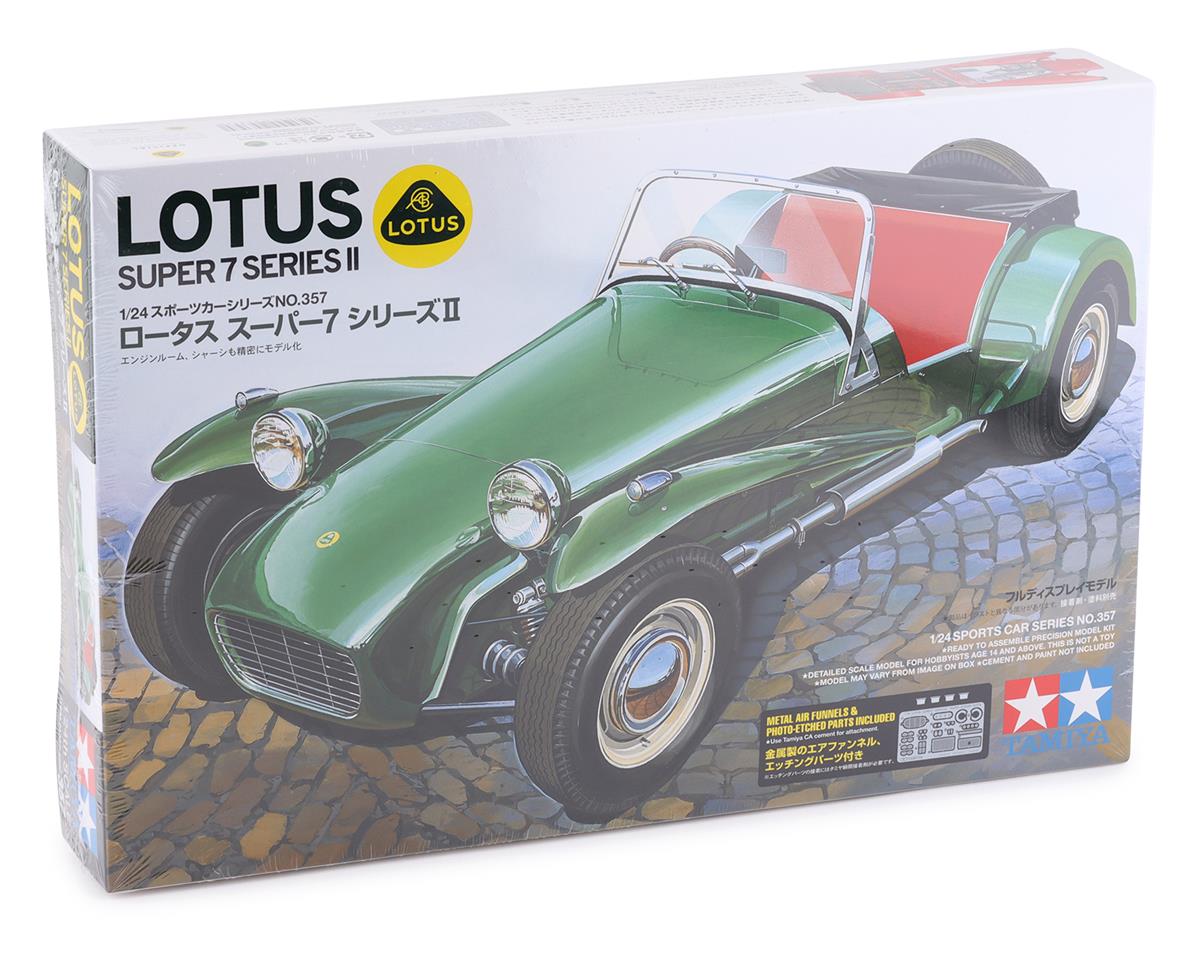 Kit de auto para armar Tamiya Lotus Super 7 Series II 1/24. El Super 7 es un icónico kit car que fue lanzado en 1957. Tamiya ha recreado muchos de los detalles, incluyendo la suspensión delantera expuesta, el escape de salida lateral, el motor Ford Cosworth de cuatro cilindros y 1.3L realista y arneses de carrera detallados. El paquete incluye un kit para armar del Lotus Super 7.