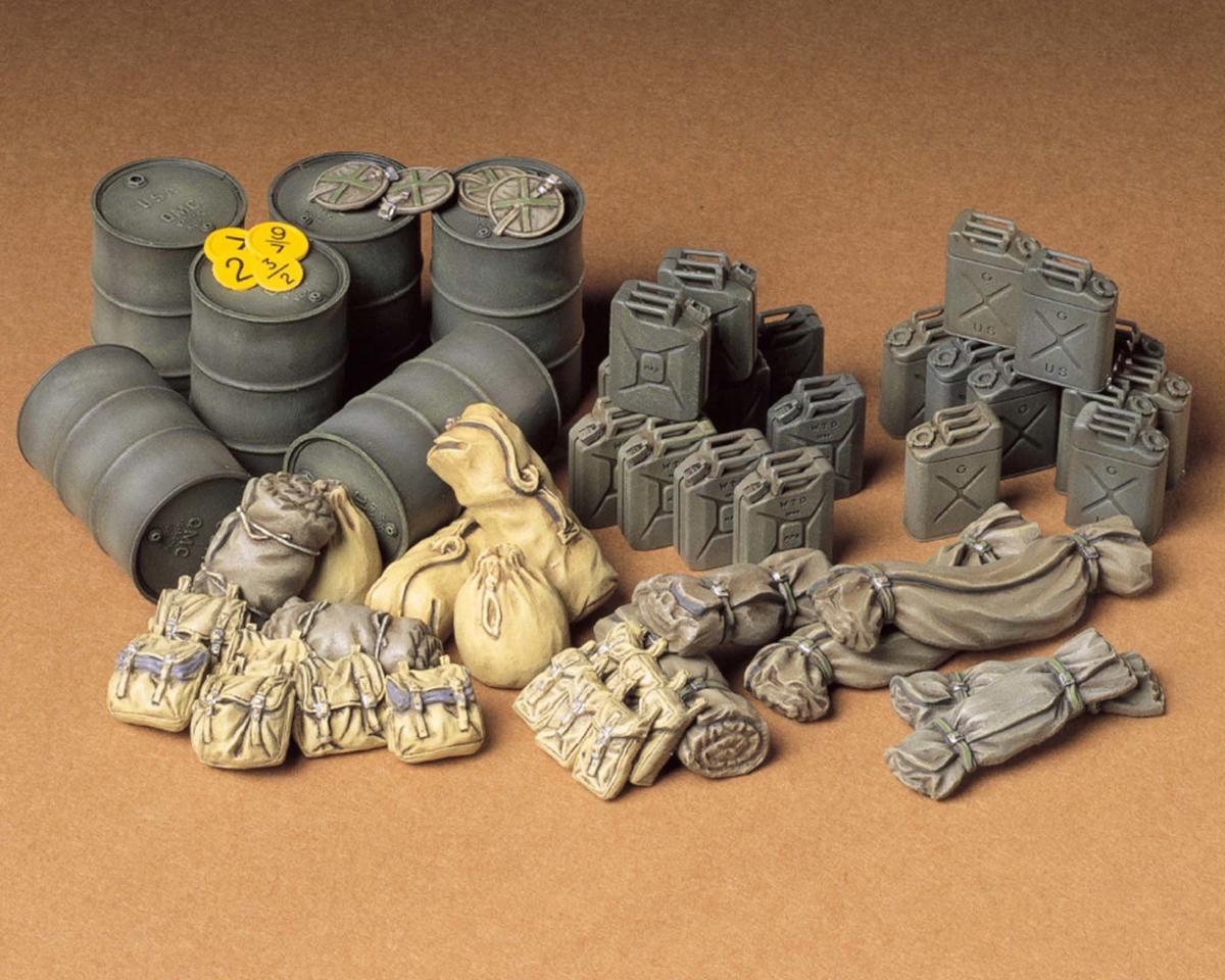 Set de accesorios a escala 1/35 con equipamiento del ejército aliado: tambores, bidones (jerry cans), baldes, bolsos de lona y placas de peso para vehículos. Ideal para dar mayor realismo a tus maquetas.