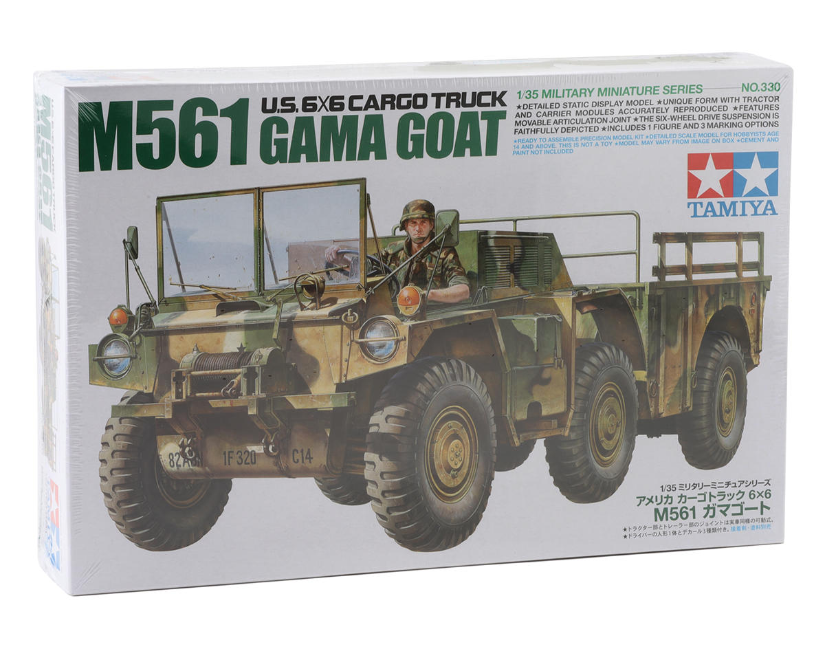 Este es el Kit para armar Tamiya 1/35 6×6 M561 Gama Goat. Comisionado originalmente en 1966 como un vehículo todoterreno anfibio, el M561 Gama Goat era un camión con tracción en las seis ruedas que consistía en un tractor de cuatro ruedas y un módulo de carga de dos ruedas. El empleo de una articulación entre los dos módulos que les permitía moverse de forma independiente es lo que diferenciaba al M561 de otros vehículos del mismo tipo. Se produjeron 14,000 Gama Goats hasta 1973, los cuales fueron utilizados en una variedad de roles tanto por el Ejército como por el Cuerpo de Marines de los EE. UU., y no fue sino hasta principios de la década de 1990 que el Gama Goat comenzó a ser retirado.