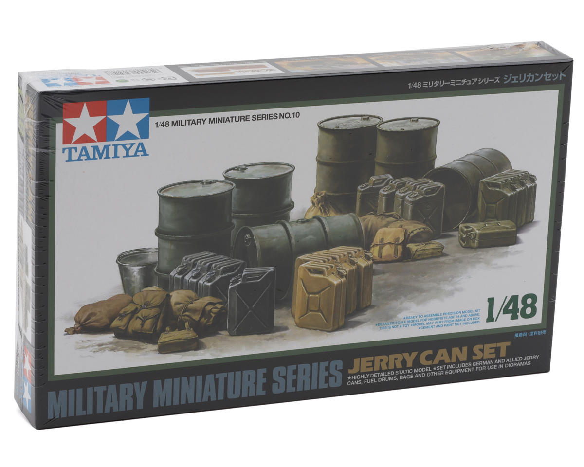 Agrega realismo a tus dioramas militares a escala 1/48 con el Set de bidones (Jerry Cans) y tambores de combustible militares de Tamiya. Con diseños tanto alemanes como aliados, junto con baldes, bolsas y más, este set aporta un detalle auténtico a tus maquetas.