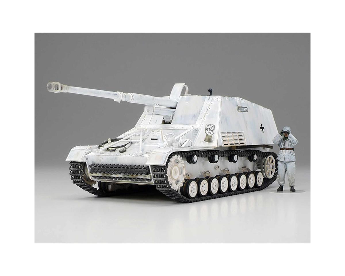 Esta es una maqueta a escala altamente detallada del cazacarros alemán Nashorn de la Segunda Guerra Mundial. El ejército alemán desarrolló cañones antitanque autopropulsados para contrarrestar a los imponentes tanques rusos T-34 y KV, y el Nashorn poseía una potencia particularmente abrumadora entre los muchos cañones antitanque producidos. La producción comenzó en febrero de 1943, y el Nashorn contaba con un cañón L/71 de 8.8 cm Pak43/1 capaz de penetrar blindaje a larga distancia. En el frente italiano, el Nashorn destruyó un M4 Sherman a 2.8 kilómetros, y su excelente potencia de fuego fue indispensable para las fuerzas alemanas hasta el final de la Segunda Guerra Mundial.