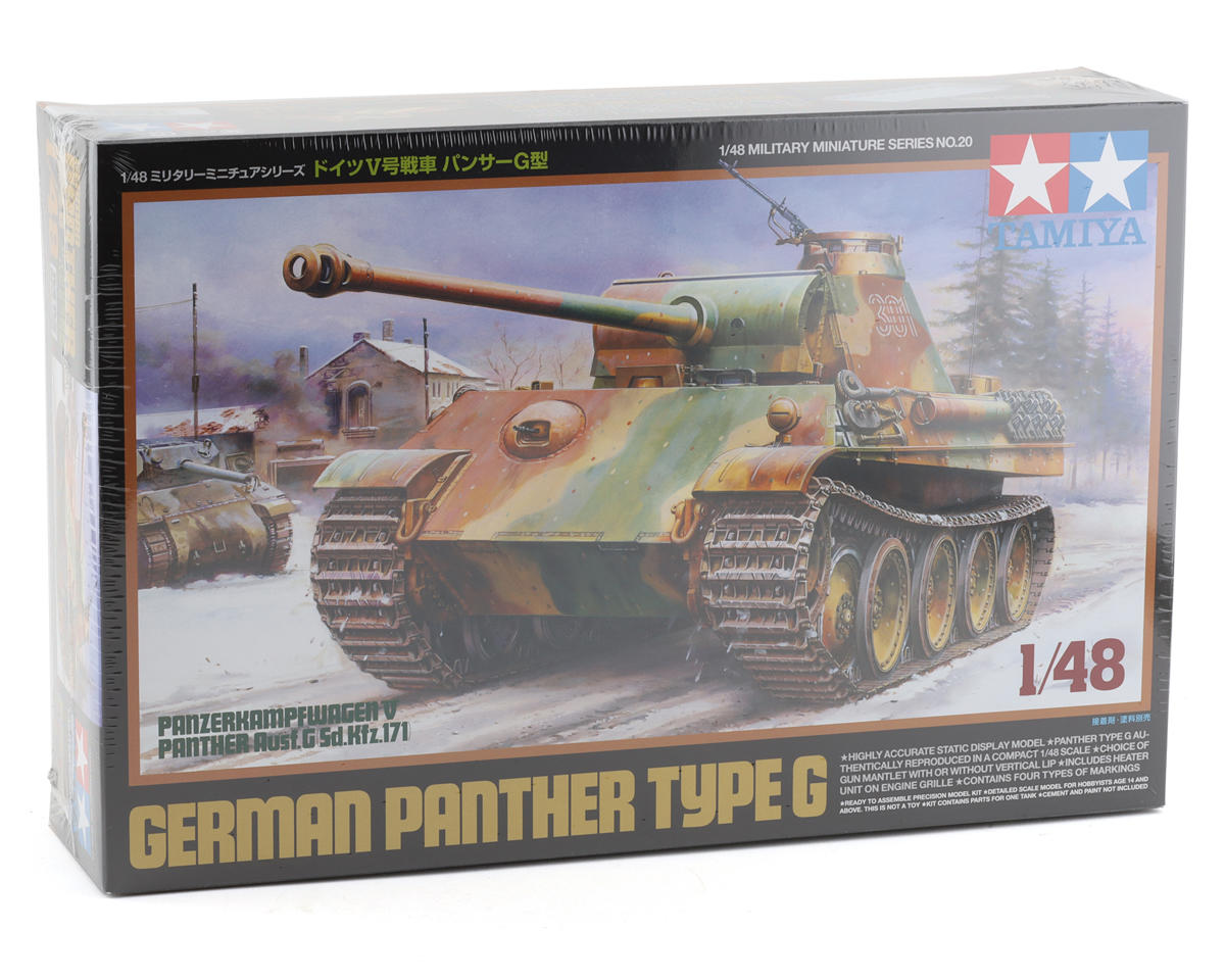 El kit de tanque para armar Tamiya 1/48 German Panther Ausf.G es un kit altamente detallado con muchas características. El Panther Tipo G de tamaño real fue ampliamente considerado como el tanque alemán más efectivo de la Segunda Guerra Mundial. Desarrollado como una contramedida al T-34 soviético, los tanques Panther se produjeron desde 1943 hasta el final de la guerra. Impulsado por un motor Maybach de 700 hp, el cañón principal de 75 mm era extremadamente devastador debido a la alta carga propulsora y al cañón largo. Todas estas características se unen en esta maqueta a escala fielmente reproducida, diseñada para verse y sentirse como el vehículo real.