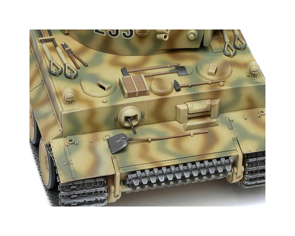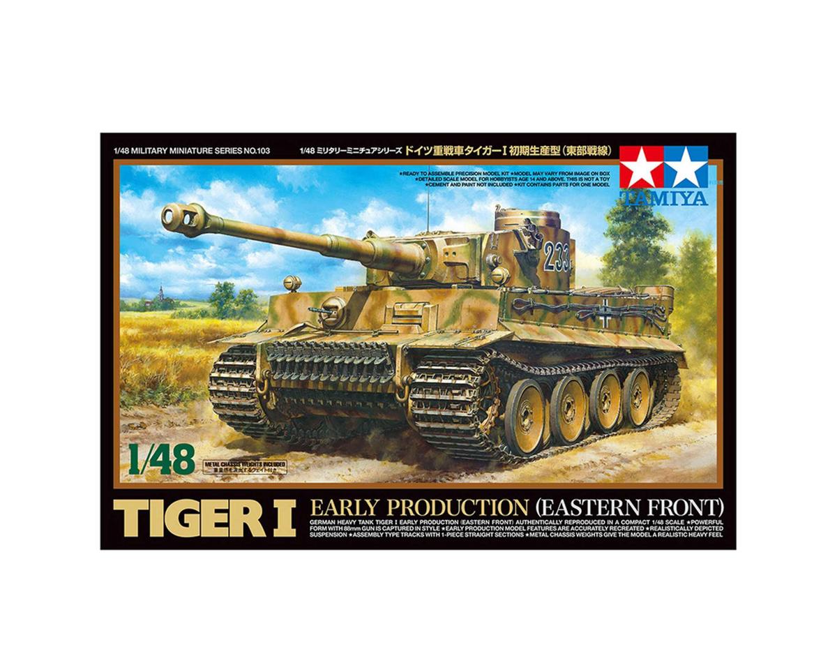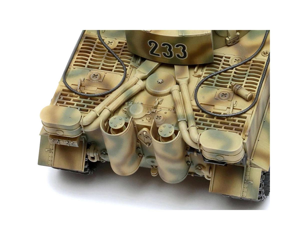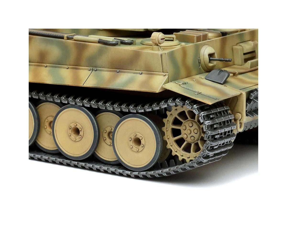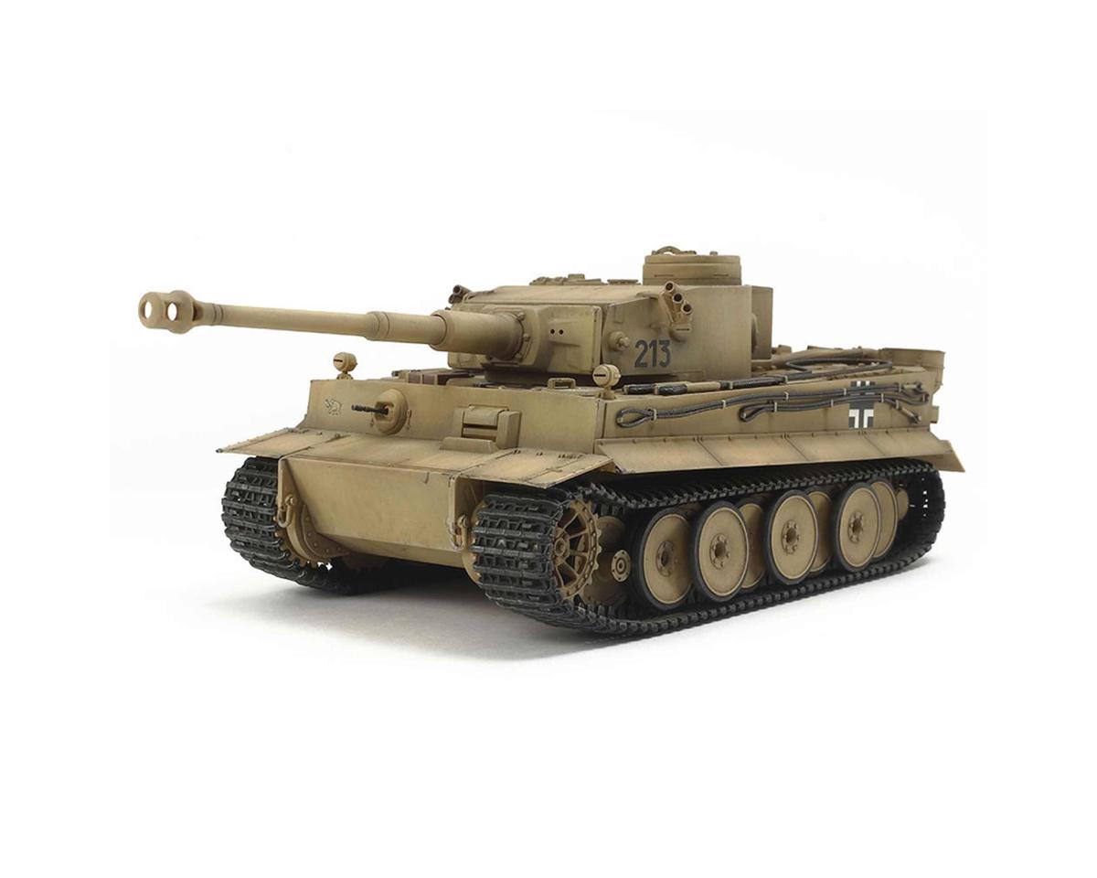 Kit de plástico para armar del tanque pesado alemán Tiger I de producción temprana a escala 1/48 de Tamiya. El Tiger I es un tanque pesado alemán de la Segunda Guerra Mundial y uno de los tanques de combate más famosos de esa época. El mando de la Panzerwaffe alemana tuvo la idea de crear el tanque durante el inicio de la guerra, pero los primeros intentos en forma del antiguo tanque Neubaufahrzeuge resultaron infructuosos. Tras el enfrentamiento con los tanques T-34 y KW-1 en el frente oriental, el trabajo en el Tiger se aceleró. El 20 de abril de 1942, el prototipo del Tiger, bajo la designación VK 4501 (H), se sometió a pruebas de campo y se puso en producción en masa poco después.