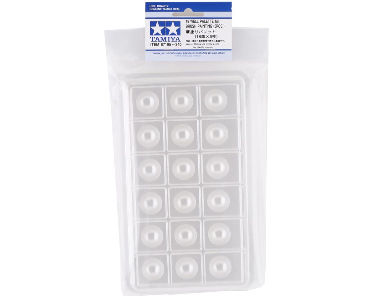 Paleta de pintura Tamiya de 18 cavidades, pack de 5 unidades. Mayor capacidad que la paleta de 15, ideal para proyectos que requieren más colores simultáneos o para pintar figuras con múltiples tonos. Superficie lisa de fácil limpieza.