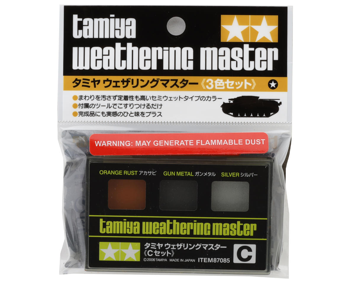 Tamiya Weathering Master Set C — Orange Rust / Gun Metal / Silver. El sistema de pigmentos secos compactos de Tamiya para añadir efectos de envejecimiento y desgaste a maquetas con un resultado natural. Cada set incluye 3 compartimentos de pigmento en polvo compactado que se aplica en seco con el pincel de esponja incluido. Sin disolventes, sin tiempos de secado. Fijar con barniz mate una vez aplicado.